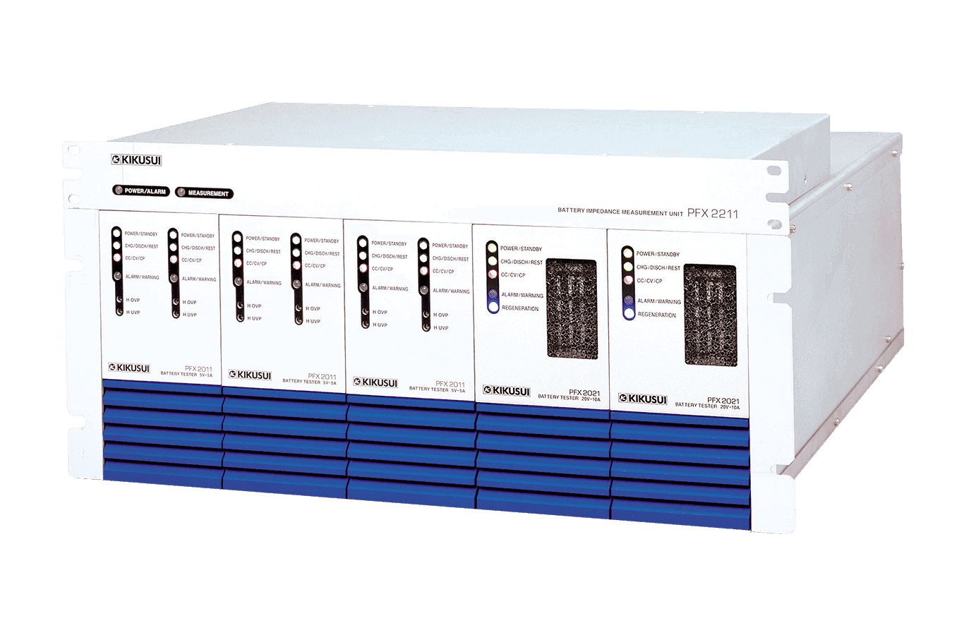 The PFX2000 Series is a battery test system developed on the basis of the experience and know-how that we have amassed through implementing numerous custom-built battery evaluation systems. The product adopts a unit structure that houses charging/discharging power supply units (PFX2011 or PFX2021) inside a unit frame (PFX2332). This enables you to build your battery test system in varying scale, from a small-size system with a single cell to a large-size system consisting of up to 120 units (max. 240 channels when all the units are PFX2011), making it possible to support any number of channels necessary for the test. Also, PFX2000 offers high availability by allowing you to replace only the unit that needs maintenance and to continue the test without stopping the entire system (hot plug feature). Each channel is completely independent of one another and thus can be controlled under different test and timing conditions. In addition, a rich set of protection features (OVP, UVP, OHP, etc.) is supported to prevent the test material from being destroyed by a system malfunction or operation mistake. * PFX2021 cannot be operated with the previous 5-unit frame model (PFX2331).