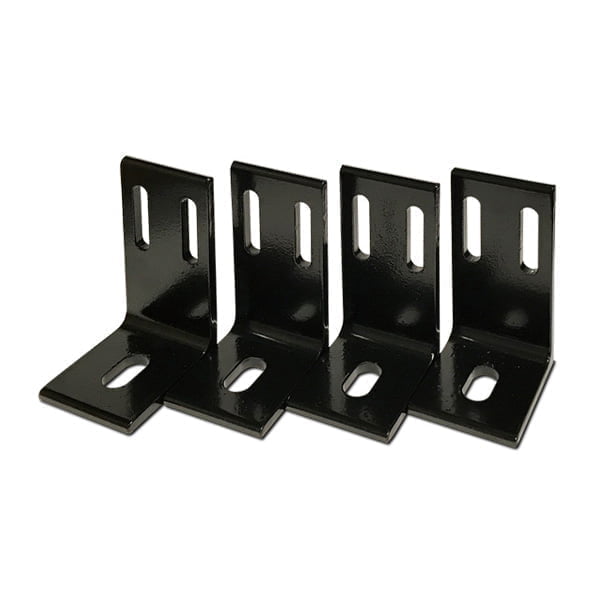 Base hold angle for KRC Series 19″ Decorative racks. These L-shaped fittings (OP03-KRC) secure the base of the rack to the floor. The set includes four main fitting components and the bolts and nuts that secure the fittings to the bases.